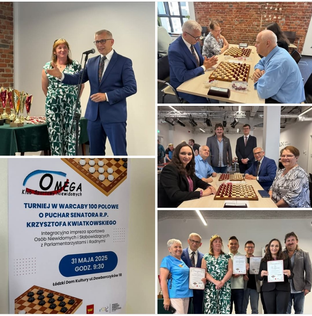 Turniej Warcabowy w Łodzi – więcej niż sportowa rywalizacja 31 maja 2025 roku Łódzki Dom Kultury przy ul. Dowborczyków 18 stał się areną wyjątkowego wydarzenia – Turnieju w warcaby stupolowe o Puchar Senatora RP Krzysztofa Kwiatkowskiego organizowanego przez Klub Sportowy Niewidomych „OMEGA”. Choć na pierwszy rzut oka był to turniej sportowy, jego prawdziwa wartość kryła się w integracji, wspólnocie i przełamywaniu barier. Uroczyste otwarcie z sercem Wydarzenie rozpoczęła Wiceprezes Klubu, Pani Beata Bartłomiejczyk, która z serdecznością powitała zawodników i gości. Wzruszającym momentem było odczytanie listu od nieobecnego Prezesa Klubu, Sławomira Gruszkowskiego, przez jego wnuka – Dawida Gruszkowskiego. Następnie głos zabrali zaproszeni goście, którym wręczono oficjalne podziękowania – gest, który podkreślił wagę współpracy i wsparcia ze strony lokalnych władz i instytucji. Siedem rund emocji Turniej rozegrano systemem szwajcarskim – siedem rund, po dwadzieścia minut na zawodnika. Nad przebiegiem rozgrywek czuwał sędzia Pan Krzysztof Biernacki, który również ogłosił oficjalne wyniki. Atmosfera była pełna skupienia, ale i wzajemnego szacunku – każdy ruch na planszy miał znaczenie, a każda partia była okazją do pokazania charakteru. Nagrody, które mają znaczenie Dekoracji zwycięzców w kategorii kobiet i mężczyzn dokonali: Wiceprezes Beata Bartłomiejczyk, sędzię Krzysztofa Biernackiego, oraz Dawid Gruszkowski. Nagrody były nie tylko symboliczne: I–III miejsce: puchary; IV–VI miejsce: medale. Pozostali uczestnicy: medale za udział w turnieju. Dodatkowo: nagrody ufundowane przez Szkołę Policealną i Licealną COSINUS w Łodzi. Szczególne wyróżnienia otrzymali: Michał Ciborski – najlepszy zawodnik turnieju, uhonorowany Pucharem Senatora RP Krzysztofa Kwiatkowskiego oraz tabletem, a Grzegorz Pietrakiewicz – najstarszy uczestnik, który otrzymał Puchar Prezesa Klubu Sport, który łączy Ten turniej był czymś więcej niż tylko grą. Pokazał, że warcaby mogą być dyscypliną dostępną dla osób niewidomych i słabowidzących, a sport może być narzędziem budowania wspólnoty. Współpraca osób z niepełnosprawnościami, parlamentarzystów i lokalnych przedstawicieli władz to nie tylko gest – to fundament integracji społecznej. Zadanie wykonane w 100% Turniej zakończył się sukcesem organizacyjnym i społecznym. Był dowodem na to, że ograniczenia fizyczne nie muszą być przeszkodą w realizacji pasji, rywalizacji i budowaniu relacji. Klub Sportowy Niewidomych OMEGA po raz kolejny udowodnił, że warto inwestować w inicjatywy, które mają realny wpływ na życie ludzi. |